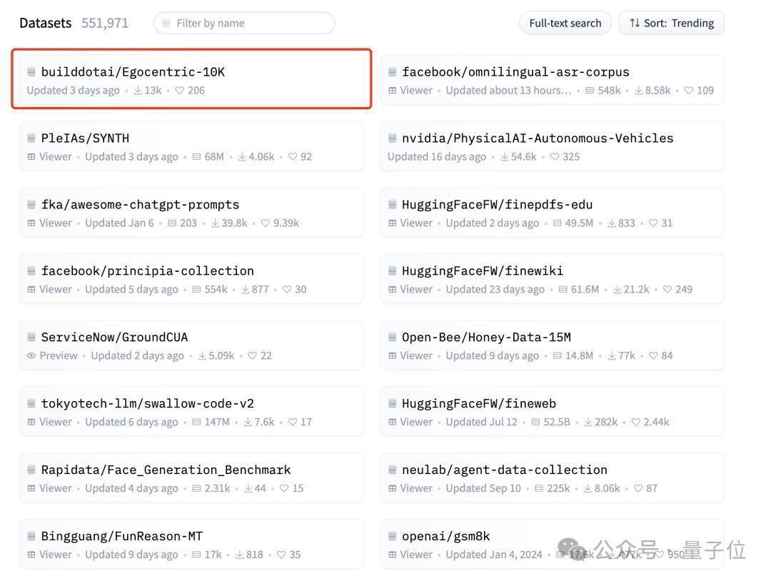发布不到三天,Egocentric-10K在Hugging Face的下载量就突破了1.3w次,并登顶趋势榜。