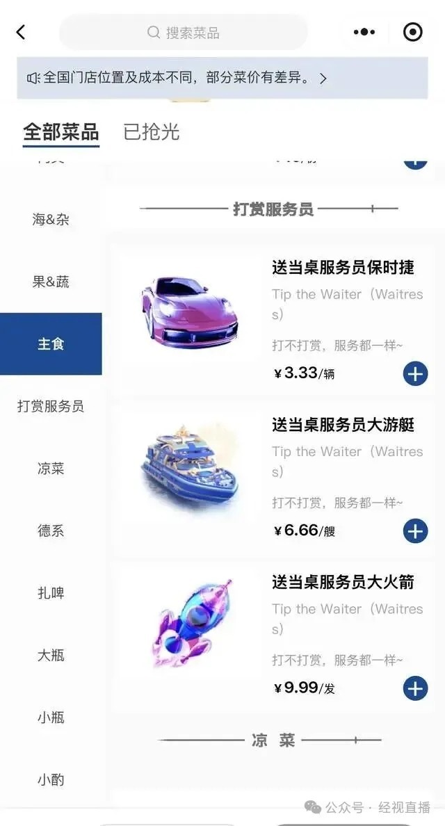 近日,有网友发文称,在连锁烧烤品牌“很久以前羊肉串”的点单小程序中,发现菜单内设有“打赏服务员”选项,内容包含“保时捷3.33元/辆”“大游艇6.66元/辆”“大火箭9.99元/发”虚拟礼物,类似网络直播中的打赏功能。部分网友质疑其为“变相收取小费”,也有网友认为“服务到位可以打赏”,观点不一。