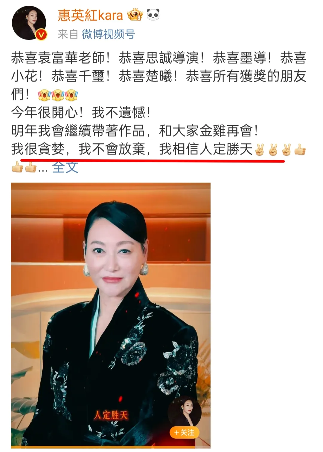 无数观众为她感到意难平,但惠英红本人倒是很洒脱,她发文:“我相信人定胜天”,尽显老艺术家的格局与胸怀。