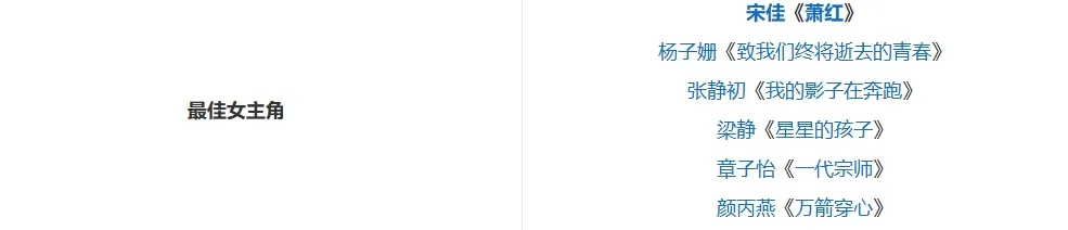 2013年,宋佳凭借电影《萧红》获得金鸡奖最佳女主角,击败的对手是《一代宗师》章子怡、《万箭穿心》颜丙燕和《致我们终将逝去的青春》杨子姗。