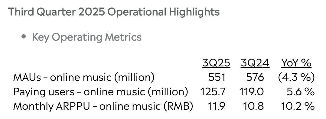 过去一个季度,TME的业绩虽保持增长,但一个不可忽视的趋势正在浮现:在线音乐月活同比下滑4.3%,付费用户仅净增130万,环比增速从此前的8.3%降至5.88%。换言之,用其听歌的人变少的同时,即便在用但愿意付费的人也在减少。